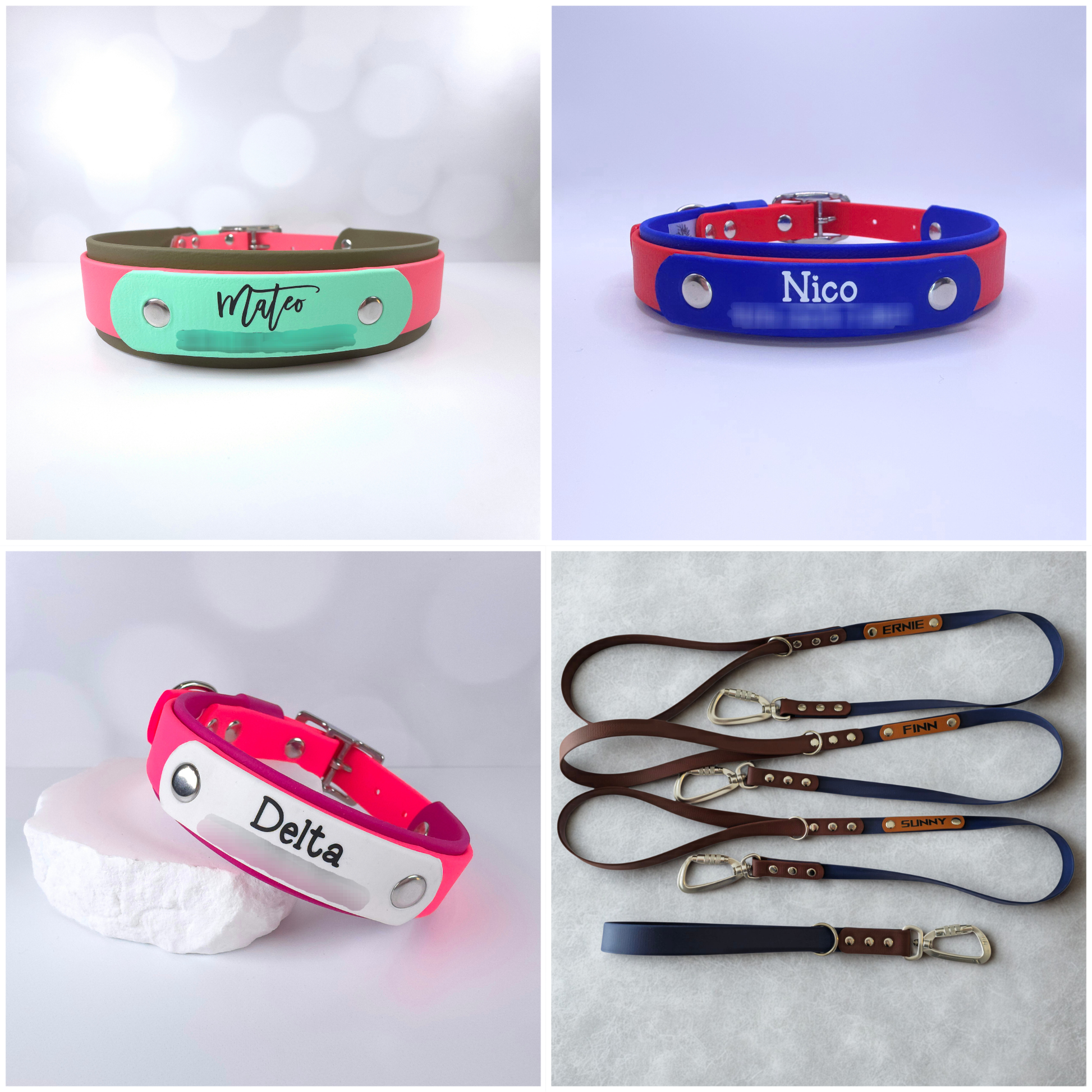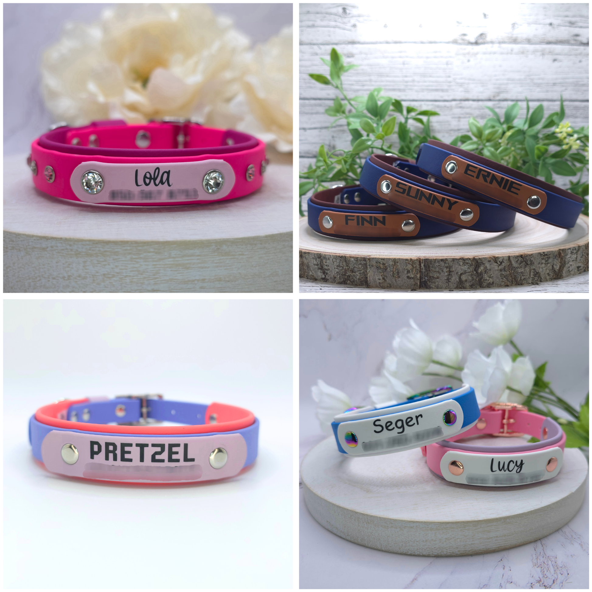 Add your dog's name and contact information to our custom collars and leashes! Made from waterproof BioThane® coated webbing and heat transfer vinyl, this add-on custom nameplate ensures your furry friend's information stays secure and visible through all their adventures.