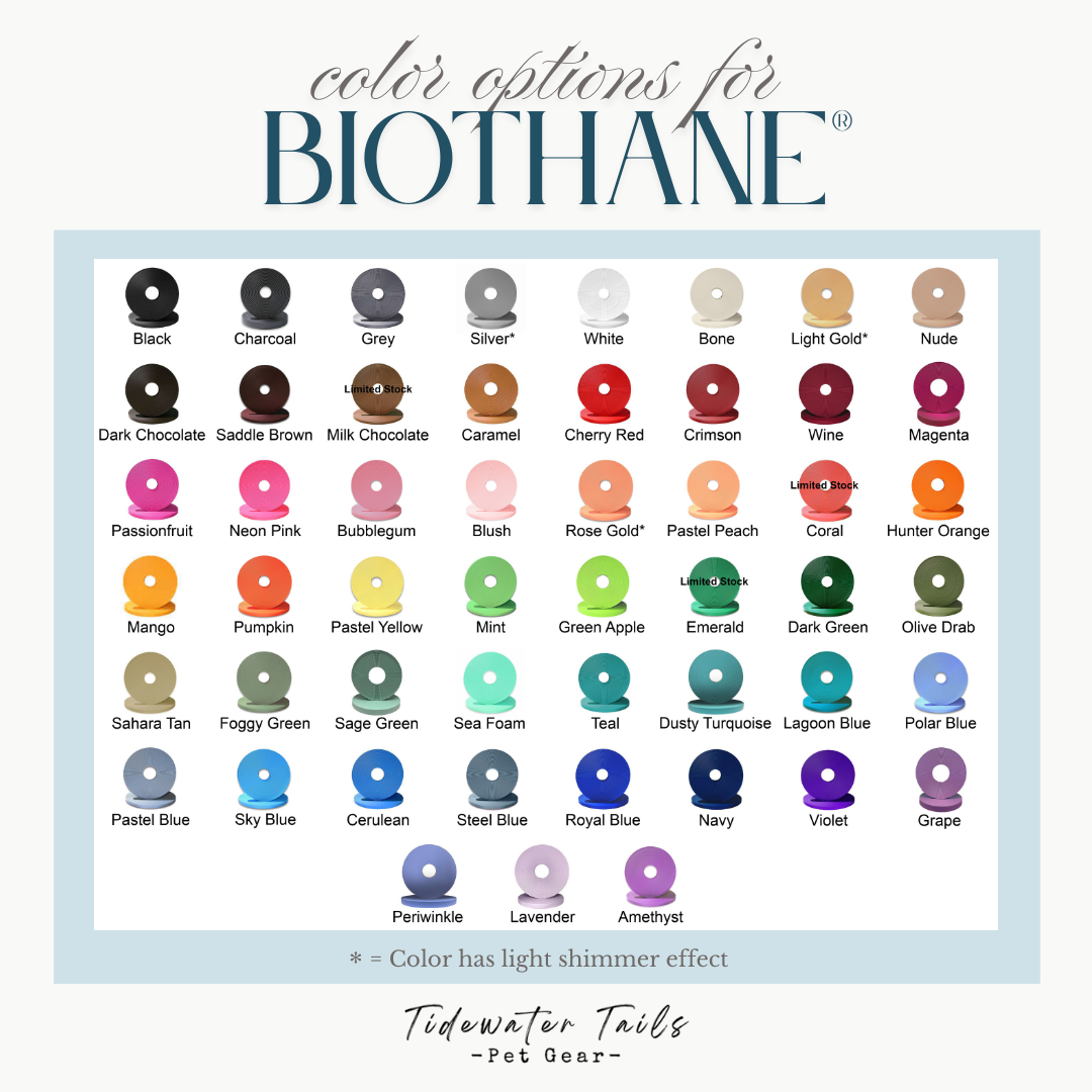 - Though rare, some BioThane® colors may bleed or transfer onto surfaces like hair, skin, or fabric. Bright and fluorescent colors are most susceptible. Please be aware of this when choosing your colors.