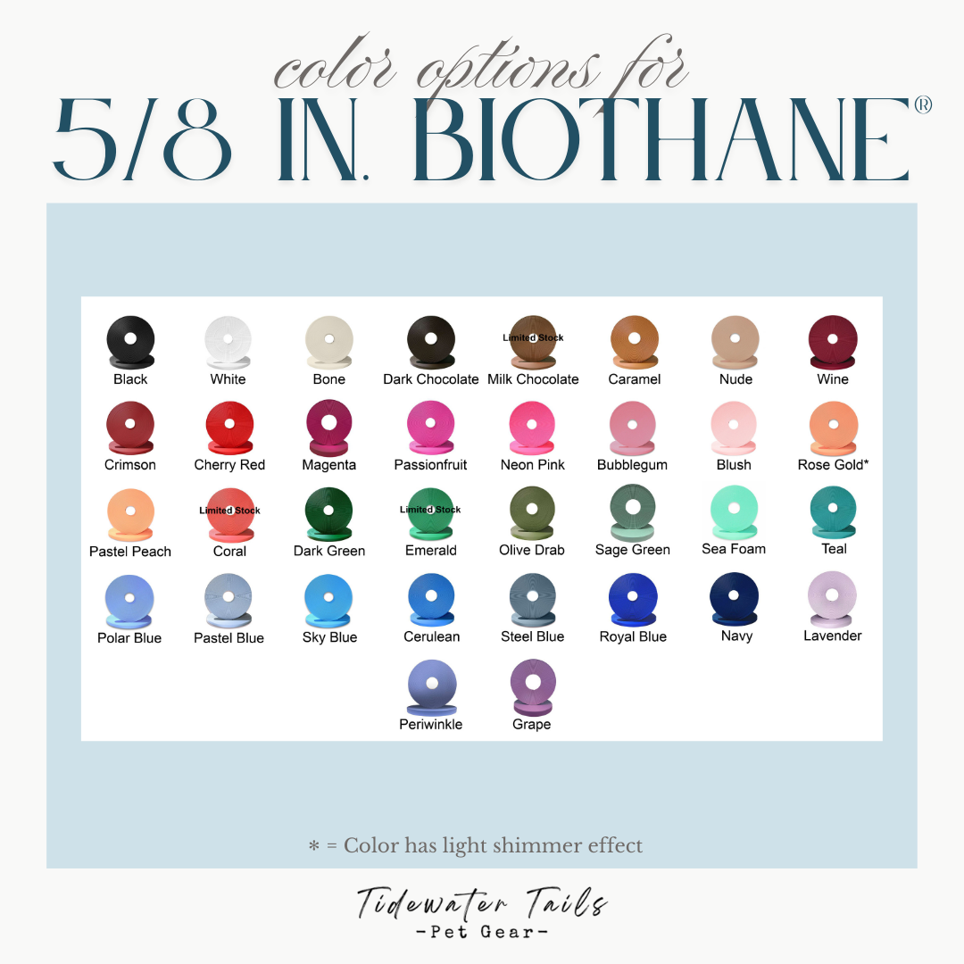 - Though rare, some BioThane® colors may bleed or transfer onto surfaces like hair, skin, or fabric. Bright and fluorescent colors are most susceptible. Please be aware of this when choosing your colors.