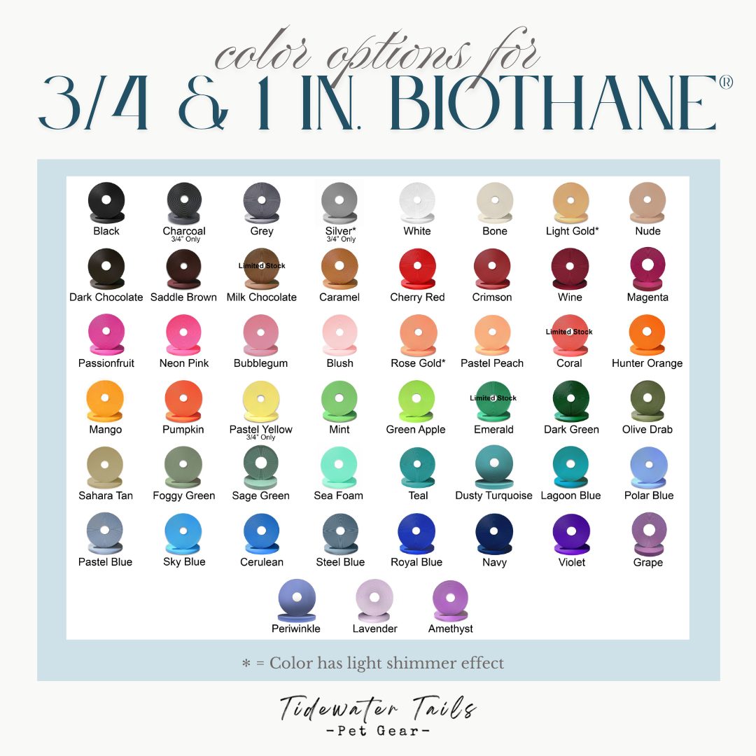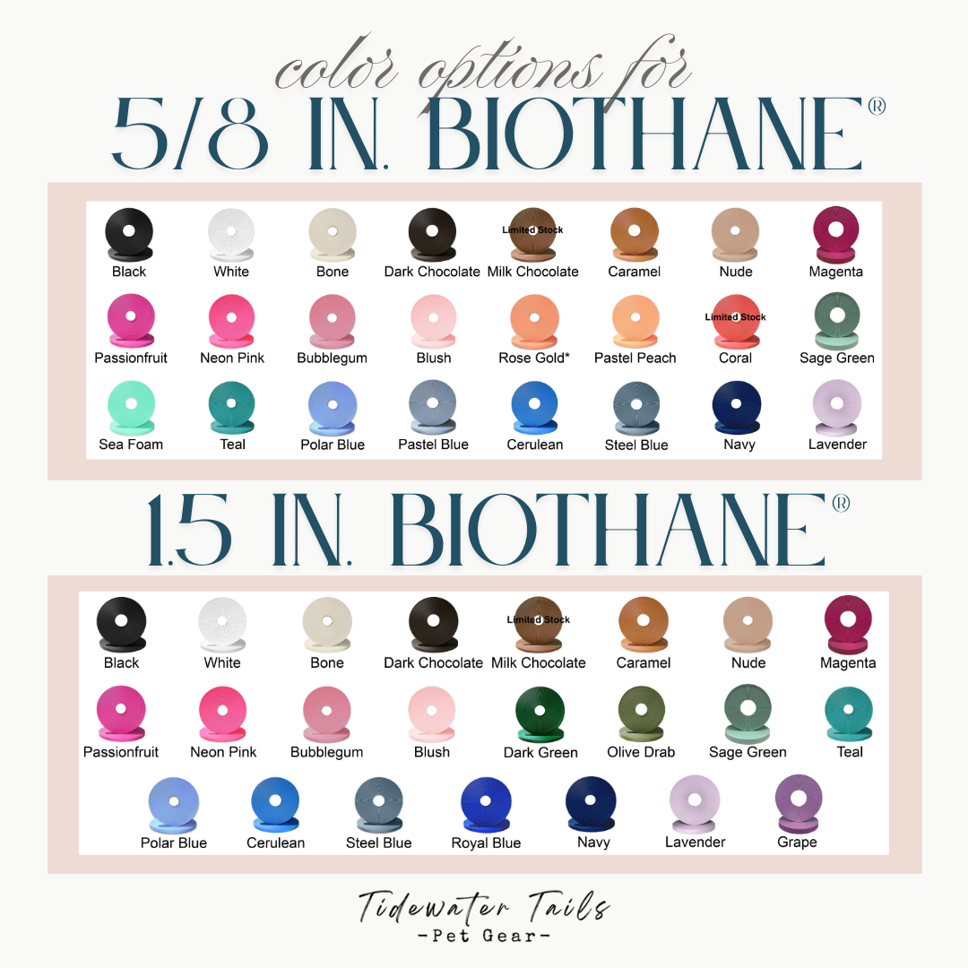 - Though rare, some BioThane® colors may bleed or transfer onto surfaces like hair, skin, or fabric. Bright and fluorescent colors are most susceptible. Please be aware of this when choosing your colors.